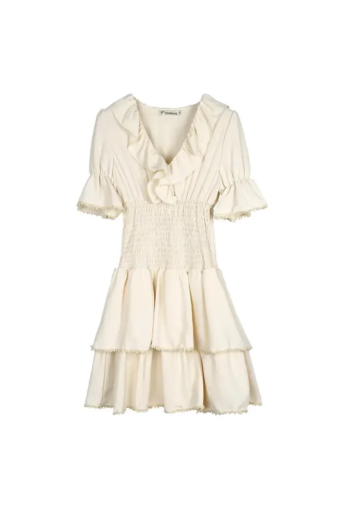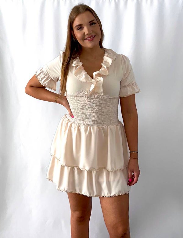 Korte jurk met mouwen, ruches en elastische tailleband. Gemaakt van polyester.